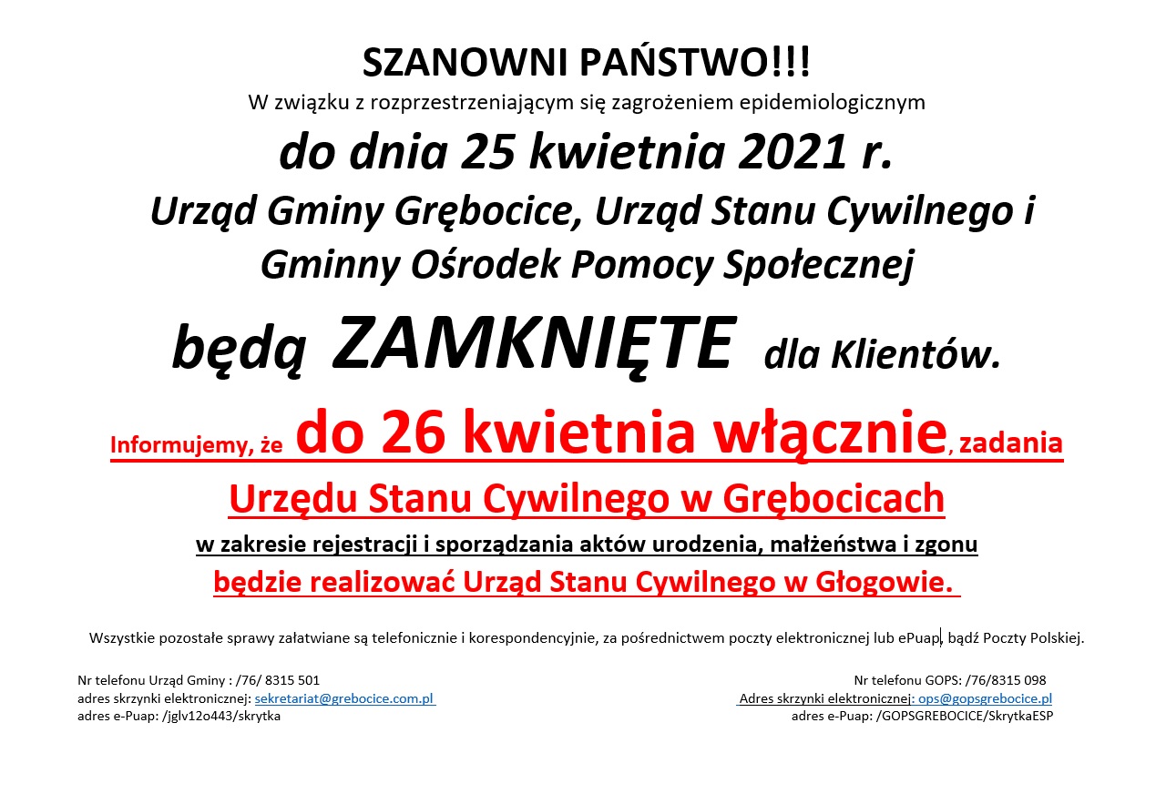 Informujemy, że do 26 kwietnia włącznie, zadania Urzędu Stanu Cywilnego w Grębocicach w zakresie rejestracji i sporządzania aktów urodzenia, małżeństwa i zgonu będzie realizować Urząd Stanu Cywilnego w Głogowie.