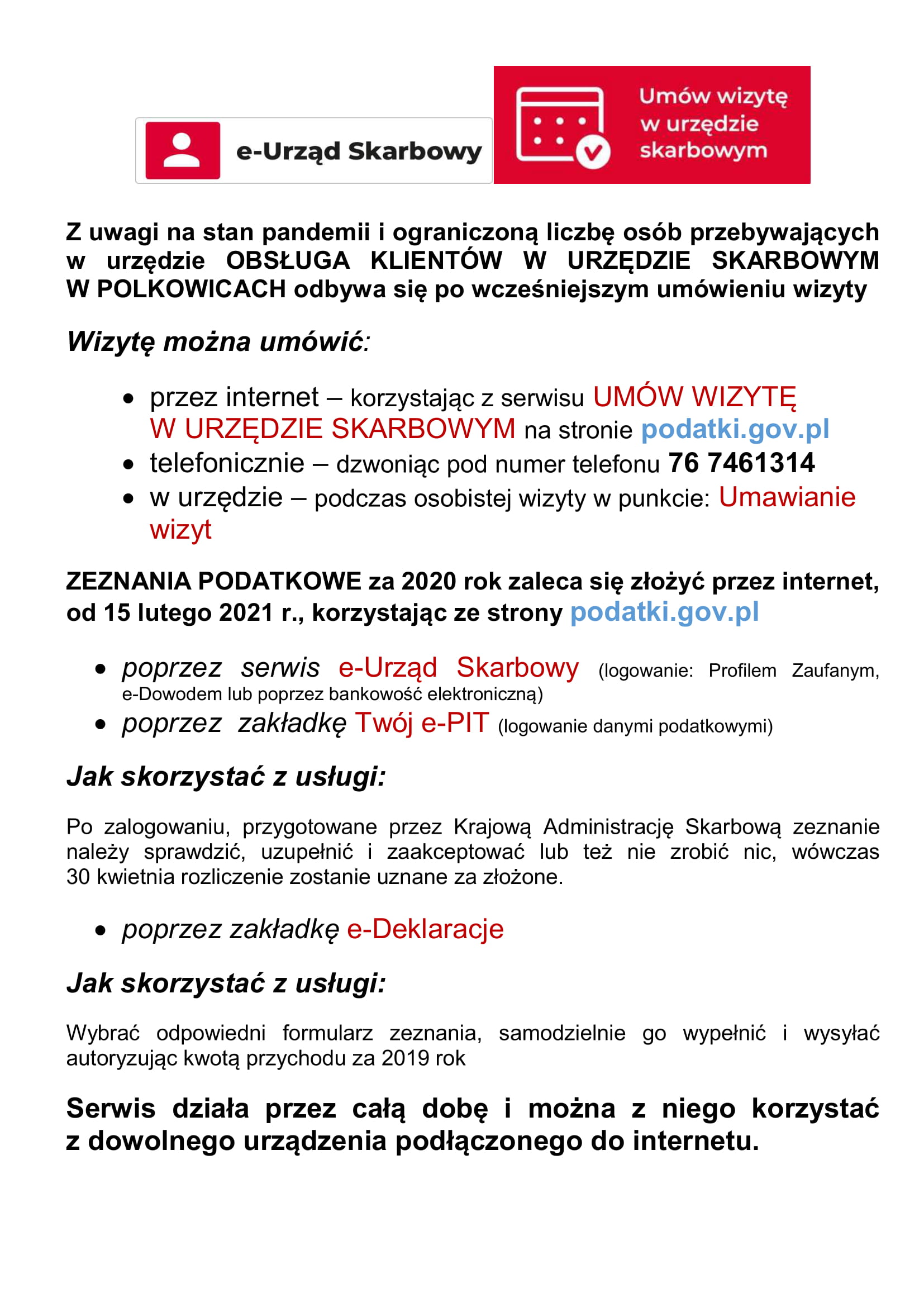 Naczelnik Urzędu Skarbowego w Polkowicach informuje, że od 15.02.2021 r. rozpoczyna się termin na składanie zeznań rocznych za 2020 rok, jak co roku oznacza to zwiększoną liczbę klientów w urzędzie skarbowym.
