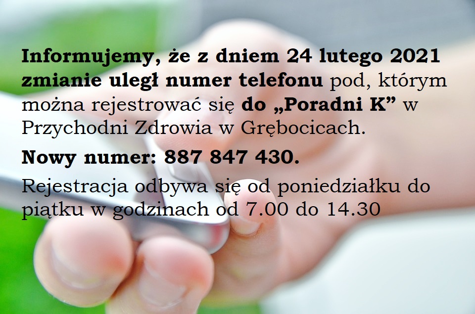 Informujemy, że z dniem 24 lutego 2021 zmianie uległ numer telefonu pod, którym można rejestrować się do „Poradni K” w Przychodni Zdrowia w Grębocicach. Nowy numer: 887 847 430. Rejestracja odbywa się od poniedziałku do piątku w godzinach od 7.00 do 14.30